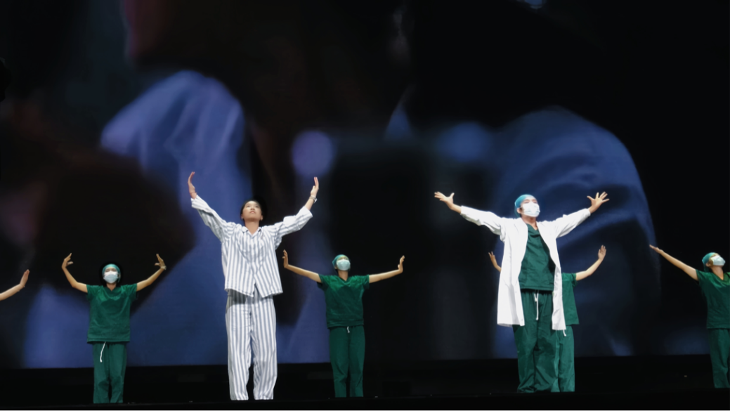 其中,临床医学院的节目舞蹈《ICU》在万众期待中登场,伴随紧张的鼓点,舞者们用极具张力的表演,构建了ICU病房中惊心动魄的生命争夺战。当身着黑色斗篷的“死神”将患者包围,是白衣为甲的医者一次次冲入重围,从死神手中抢夺生命的希望。然而,舞蹈最动人的一笔在于尾声:患者终于站起,那位竭尽全力的医生却黯然倒下。这一幕深刻地揭示——他们并非不死的神明,也只是会受伤、会牺牲的凡人,却依然选择为生命而战。