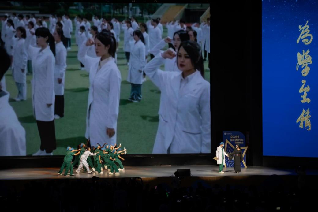 余音绕梁,校歌响起,节目中的故事圆满落幕,演员们从节目中向我们走来,仿佛不同的时空与人生交叉,踏着音乐,一同执笔,共同书写未来的青春华章。未来路漫漫,慢慢即漫漫。愿临床医学院新生们以勇气扬帆,探索人生美好,为临床医学院的发展注入新活力,共同谱写更加辉煌的明天!