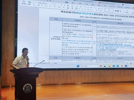 基础医学院副院长吴昊针对2025 学年全体教师目标任务书进行全面阐释。他从更好的学习成效、政府认可度显著提升、高质量完成二级学院其他工作三个方面开展三大模块任务指标讲解。