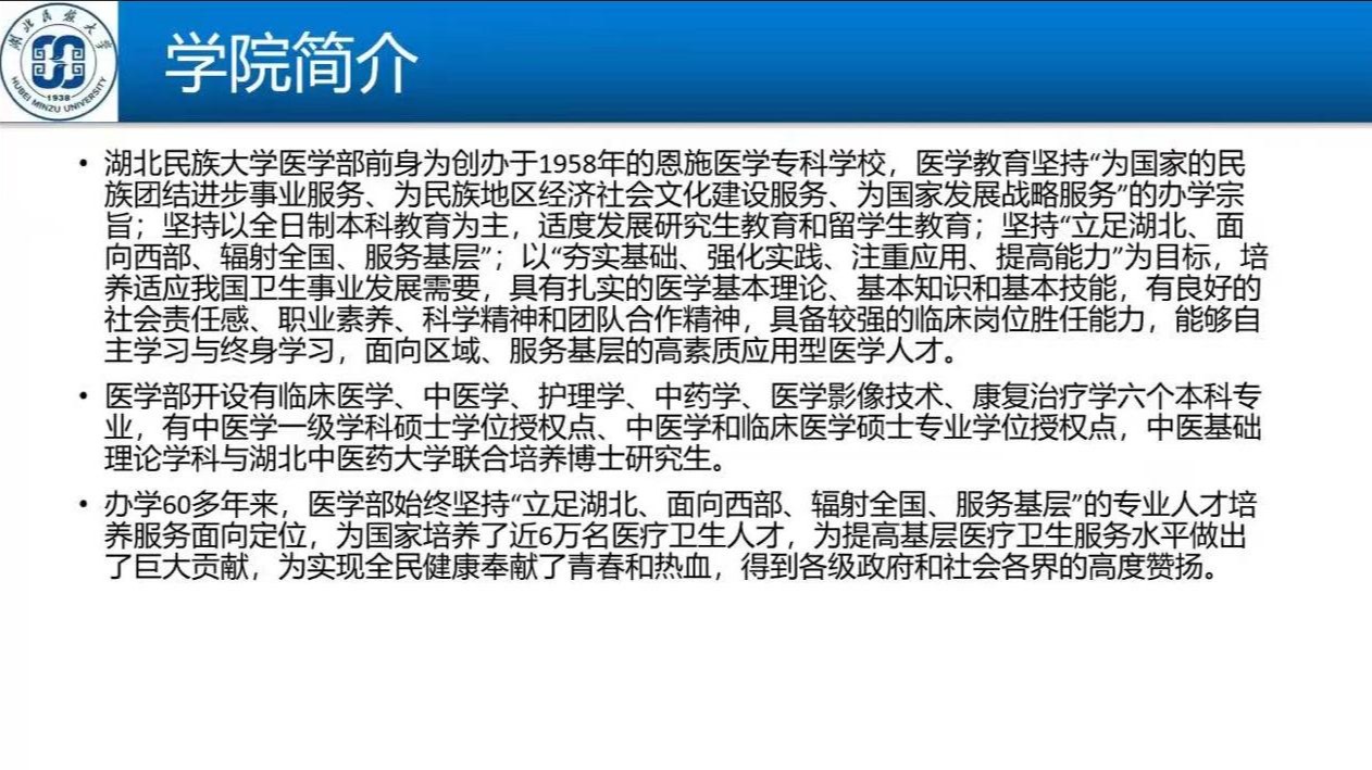 本网讯 为助力我院学子精准把握考研动态、明晰目标院校信息、科学规划升学路径,湖北恩施学院临床医学院学生发展中心于2025年10月19日19:30—21:00,以线上形式举办“携手民大•研途引航—2026年考研联合宣讲会”。活动特邀湖北民族大学医学部党委副书记、研究生与学科建设管理办公室负责人等嘉宾莅临,为我院学子们带来一场权威、全面的考研资讯分享盛宴。