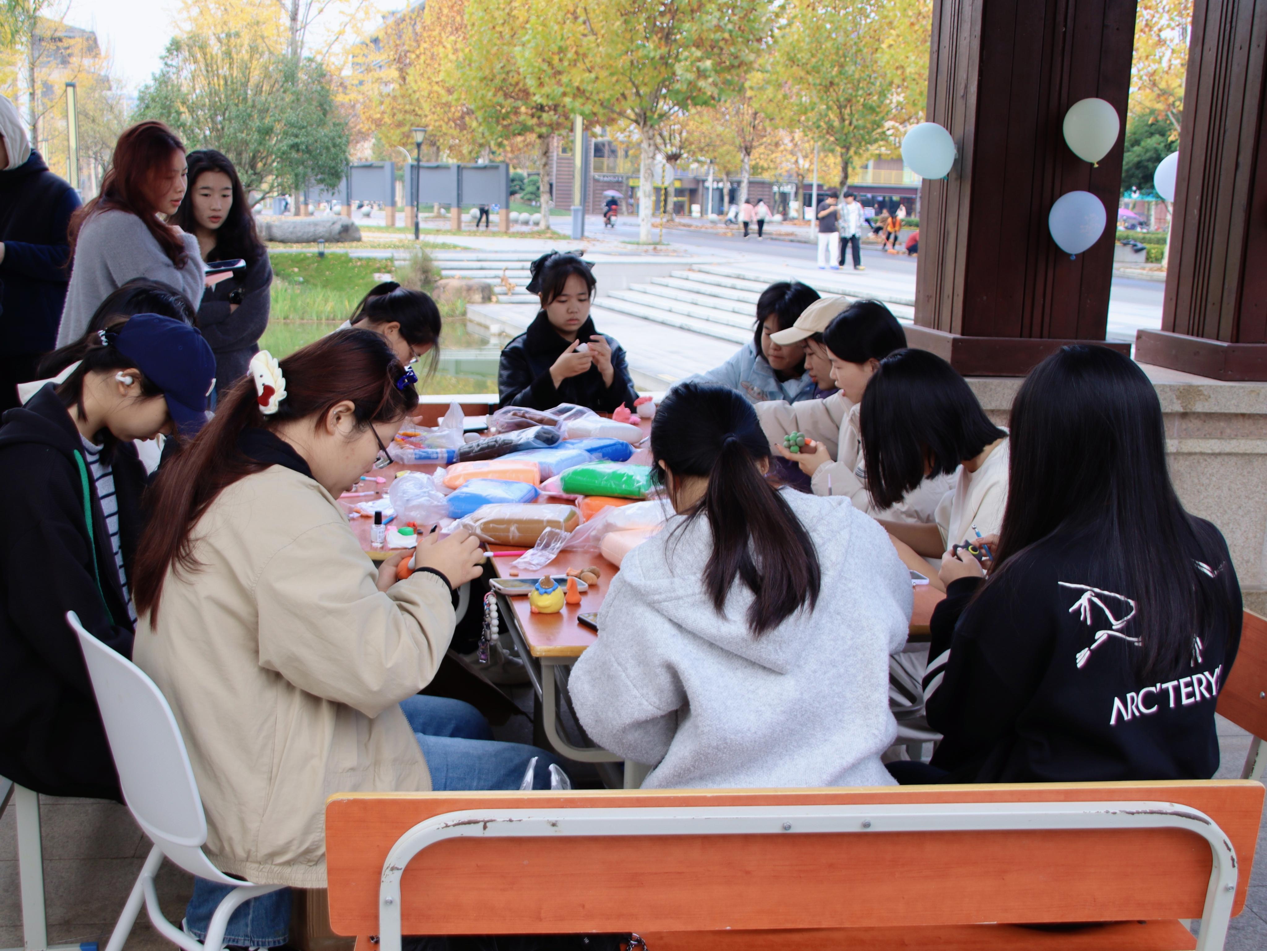 同学们围坐桌前,揉、捏、搓、粘间,粘土变身形态各异的作品,现场不少同学是首次接触黏土创作,在干部们的耐心指导下,从“不知从何下手”到“渐入佳境”:有人捏出了抱着书本的“学霸小熊”,调侃这是“日常状态的缩影”;有人还原了如琴湖的湖光一角,将眼前风景揉进了掌心的作品里。创作现场没有“大师指导”,却处处是灵感互助的热闹,交流声里满是轻松暖意。