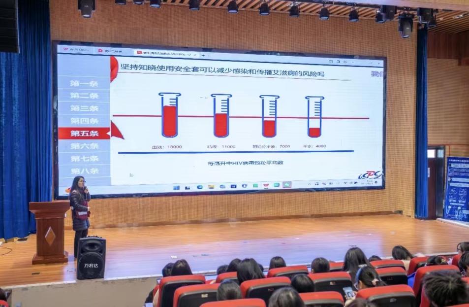 讲座过程中,主讲老师以认真严谨的态度,严肃的语言以及平易近人的语气,一边翻动大屏幕,一边向同学们讲解有关防艾的各方面知识。与此同时,老师结合真实数据分析与案例讲述,系统介绍了艾滋病的传播途径、防治进展以及日常生活中的注意事项。老师强调,艾滋病可防可控,消除歧视与误解与科学防护同样重要。