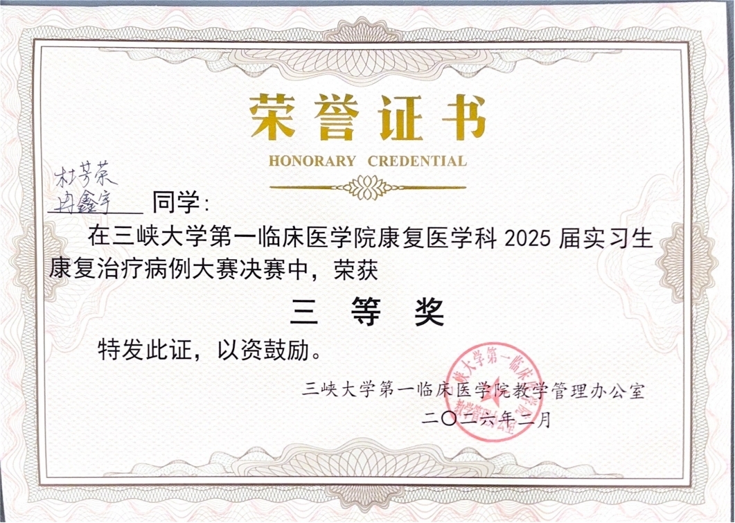 冉鑫宇、杜芳荣在宜昌市中心人民医院康复医学科实习生病例分析荣获三等奖