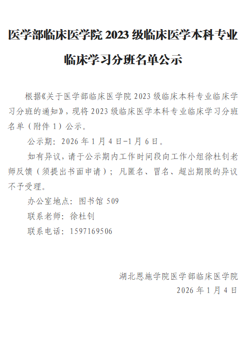 湖北恩施学院医学部临床医学院2023级临床医学本科专业临床学习分班名单公示