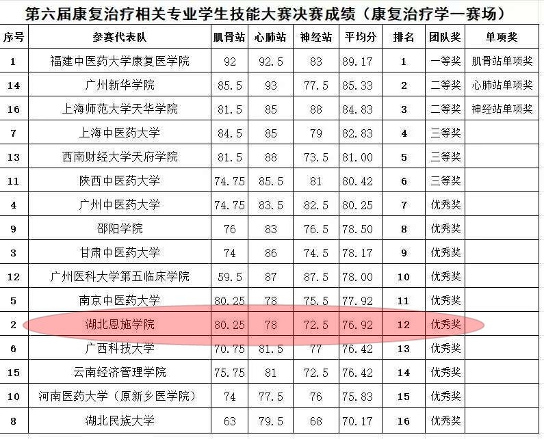 第六届康复治疗相关专业学生技能大赛,以国家教育标准为基础,结合WPT、WFOT和ISPO等相关国际教育标准,采取案例分析和操作技能考核相结合的方式进行。康复治疗组决赛共36支队伍参赛,我校医学康养系主任冉淦成老师带领四名学生参赛选手组队进入全国康复治疗学专业决赛赛道,在康复治疗学一赛场,排名十二,获得团体优胜奖。