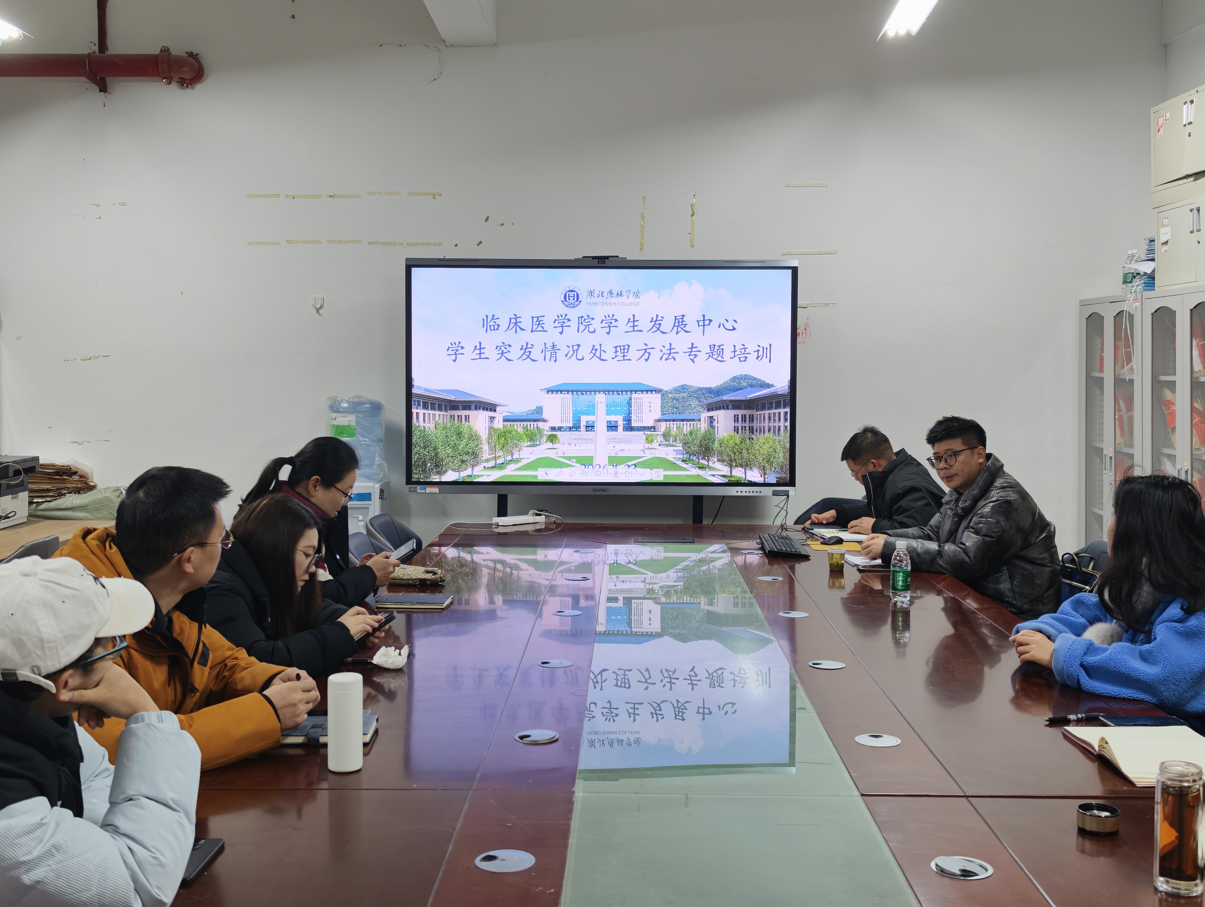 本网讯 当前学生面临的突发事件日益受到关注,为提升临床医学院全体辅导员的应急处置能力,帮助他们在面对突发情况时能够快速、妥善应对。2026年1月23日上午,临床医学院学生发展中心特邀湖北民族大学体育学院学生科科长张弋明开展了一场以“学生突发情况处理方法”为主题的专题培训讲座。临床医学院学生发展中心学生突发情况处理方法专题培训张弋明科长凭借多年学生管理工作经验,对学生可能遭遇的各类突发状况展开详细阐释,...