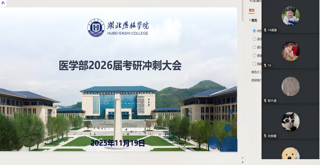 本网讯 随着2026年全国硕士研究生招生考试进入倒计时,为帮助备考学子在最后冲刺阶段实现科学高效复习、稳定备考心态,11月19日晚,湖北恩施学院医学部依托腾讯会议平台,成功举办考研冲刺线上指导会。医学部2026届本科毕业班全体考研学子在线参会,会议期间互动频繁、氛围热烈,切实为学子们的考研冲刺之路注入 “强心剂”。云端寄语暖人心,坚定信念鼓干劲活动伊始,健康学院学生发展中心就业主管朱浩瑞代表学院向全体考研学...